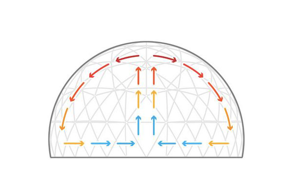 Kupole omogočajo optimalno izrabo prostora brez notranjih podpornih stebrov, njihova oblika pa spodbuja naravno kroženje zraka in povečuje energetsko učinkovitost.